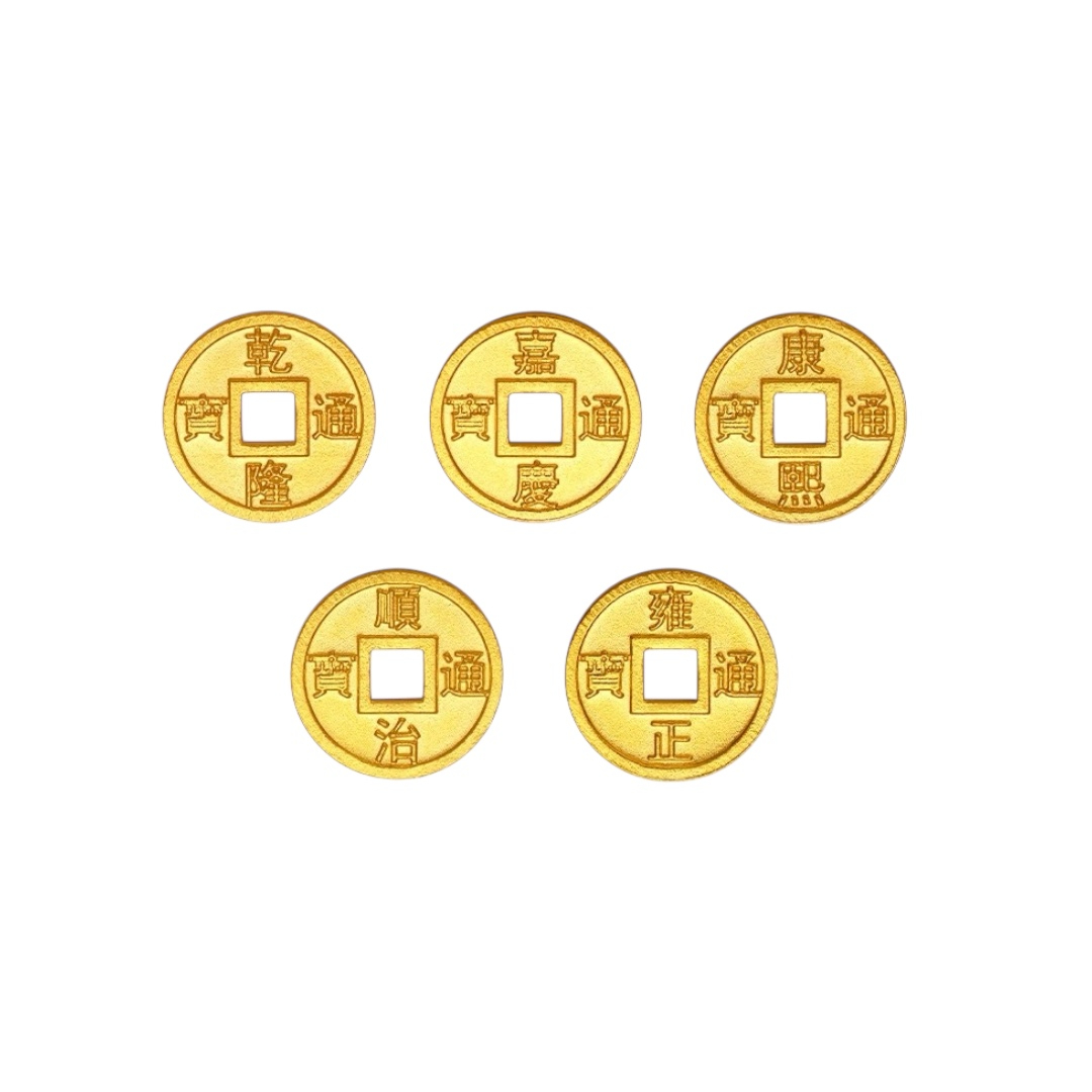 五帝錢:如「順治」的「順」寓意順利、遂心;「康熙」的「康」寓意健康、平安;「雍正」的「雍」寓意富貴和仕途如意;「乾隆」的「乾」與「錢」諧音,符合人們對富裕生活嚮往意願;「嘉慶」的「嘉」寓意完美和諧。也正因為如此,坊間民眾熱衷將「五帝錢」連綴收藏,代表了人們對吉祥美好的追求。