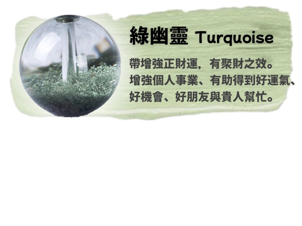 凝聚財富,正財能量。 別稱「鬼佬財神」,因色彩與美金相似。 能提高思維,高度凝聚財富, 強大的聚集財富能量, 有利於生意發展、開疆拓土, 想在公司事業更上一層樓者,極適合配戴綠幽靈。 屬招正財能量,代表因辛勤努力而累積的財富。