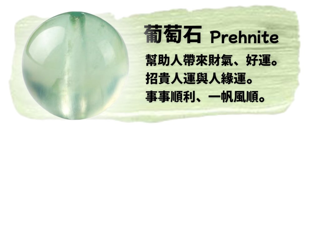 動人魅力,一帆風順。 可以緩和緊張的情緒,令情緒和緩下來, 當溝通合作進行不太順利時, 持有葡萄石,可以調整成員的狀況, 士氣提升,培養協調性。能增強個人魅力、促進血液的循環、美容養顏, 對女性十分的適合,隨時散發動人的魅力。 葡萄石還是一款比較好的招財寶石, 它能夠幫助人帶來財氣, 凝聚財富氣場。 讓你能夠在事業上、財路上一帆風順。