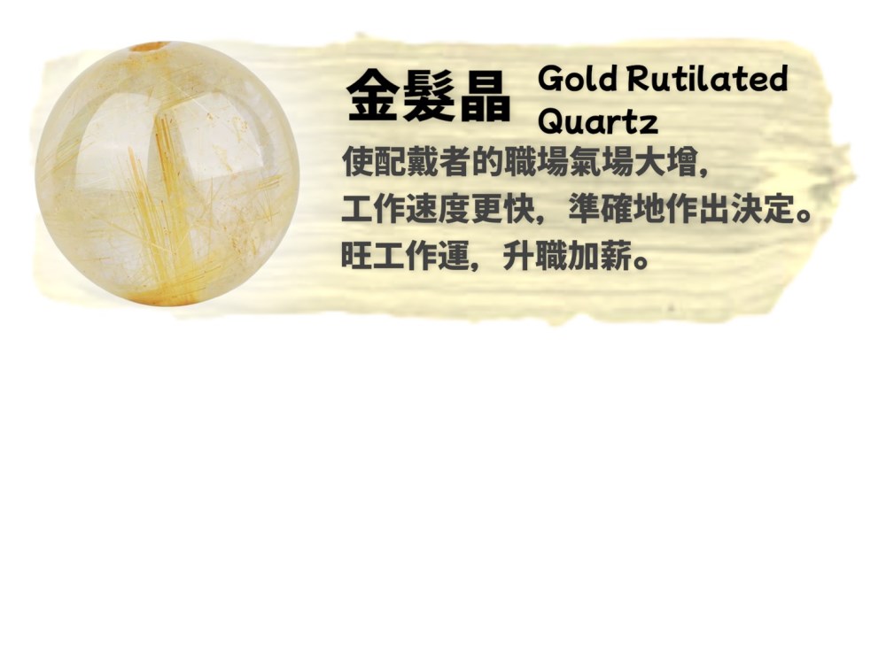 別稱-開運水晶、發晶,增強財運、創造財富。 能量-積極旺盛的企圖心、衝勁、膽識, 權威的能量,有助於貫徹與執行,信心、 倍大自己的意念力的作用, 使人有能力夢想成真, 給人們擁有財富、家庭以及人緣運都一樣好的, 使人得到完美的人生。
